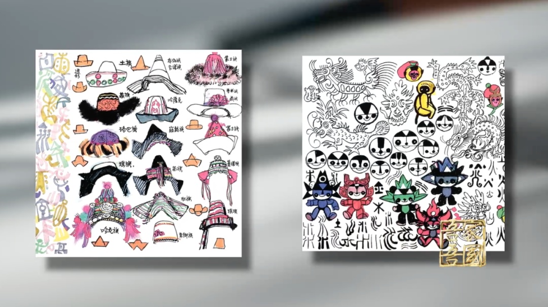 韩美林认为,应该创造出“融入中华民族文化的吉祥物”。他用上千个日夜打磨,在厚厚的画册里设计了各种早期福娃形象,比如福娃的一顶帽子,他就画了融合各民族元素的不同版本。