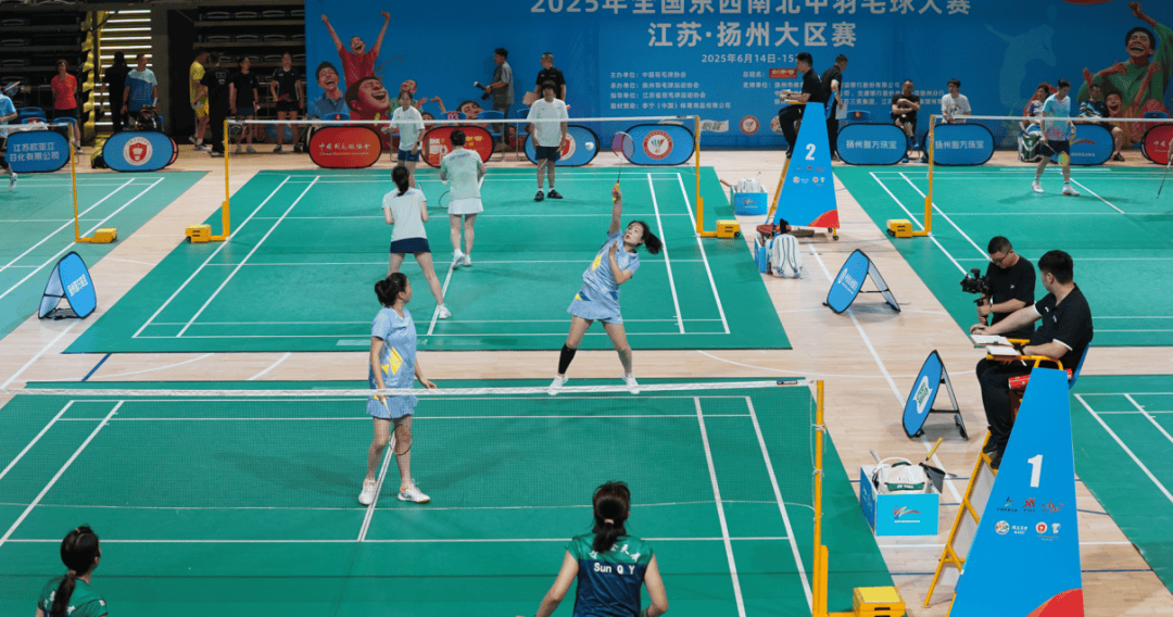 ▲6月14日-15日,2025年全国东西南北中羽毛球大赛江苏·扬州大区赛在体育公园体育馆举行。