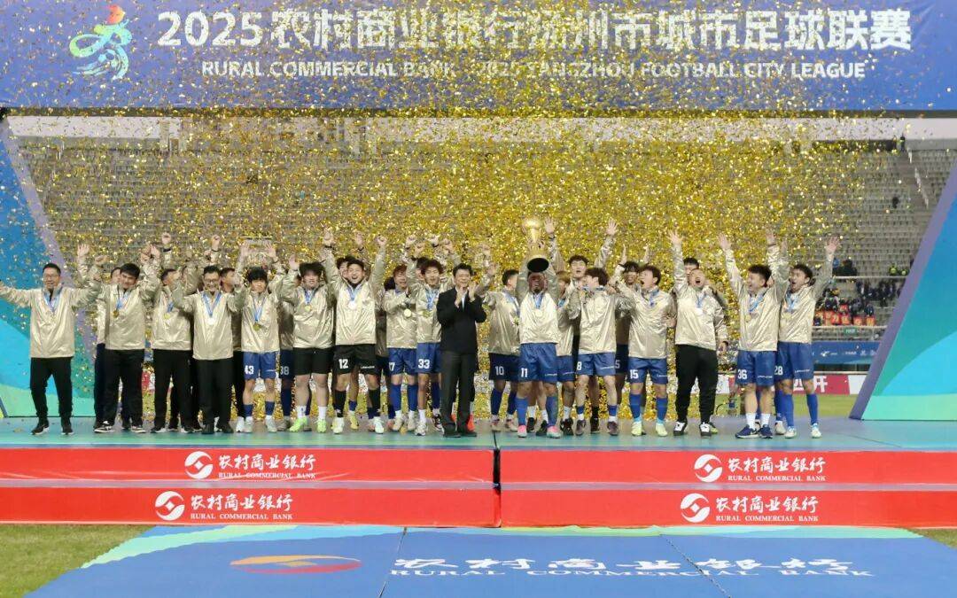 ▲11月22日,2025年扬州市城市足球联赛县域组决赛在体育公园体育场举行。经开区代表队夺得首届“扬超”县域组冠军。