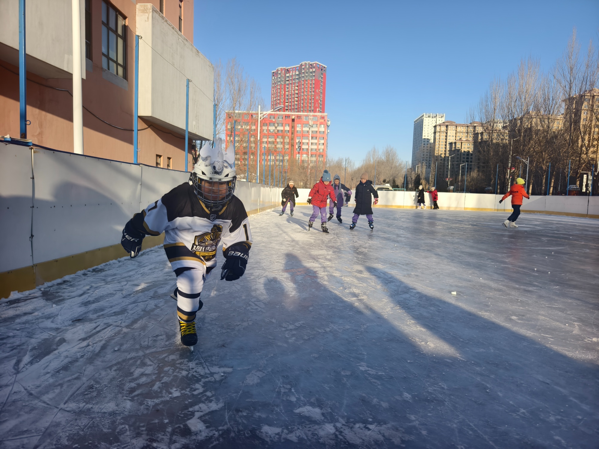 走进哈尔滨市实验学校校园,600平方米的冰场上活力四射。高年级学生身着冰球服练习传球,或在冰面上展示优美的花样滑冰动作,旋转跳跃间赢得阵阵喝彩。雪上活动则更受低年级学生欢迎:在体育老师组织下,学生们带着雪圈、滑雪板依次从雪滑梯上飞下;雪地拔河、雪地足球等项目让孩子们玩得不亦乐乎。“自2015年建校起,实验学校就有意识地培养学生的体育运动兴趣,经历了一个从0到1、从1到百的启蒙和引导过程。”试验学校副校长高阳介绍。实验学校构建了覆盖小学至初中的“阶梯式”冰雪课程体系,依据不同学段精准设定目标、科学安排课程,形成了连贯递进的冰雪育人新体系。