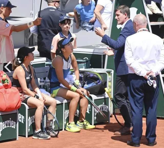 在去年法网女子双打第3轮比赛中,接受大会相关人员说明的加藤未唯(左)、斯查迪组合,因失去资格而被淘汰