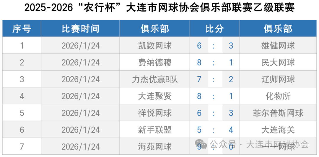 网球联赛,ATP赛程,WTA积分,网球直播入口,网球世界排名,四大满贯赛/实时更新全球网球联赛2025赛程、比分、排名及直播,全面覆盖ATP男子联赛、WTA女子赛事、四大满贯及国内网球比赛,为中文网球迷提供权威资讯与竞猜预测支持。2025-2026“农行杯”大连市网球协会俱乐部乙级联赛赛程已过半,赛场竞争愈演愈烈,冲甲格局呈现多点开花的精彩态势。本轮战罢,凯数俱乐部依旧保持稳定发挥,以扎实的赛场表现继续领跑积分榜;聚贤、费纳德穆紧随其后,分列积分榜第二、第三位,与榜首的积分差距始终保持胶着,形成第一集团的强势竞争态势。