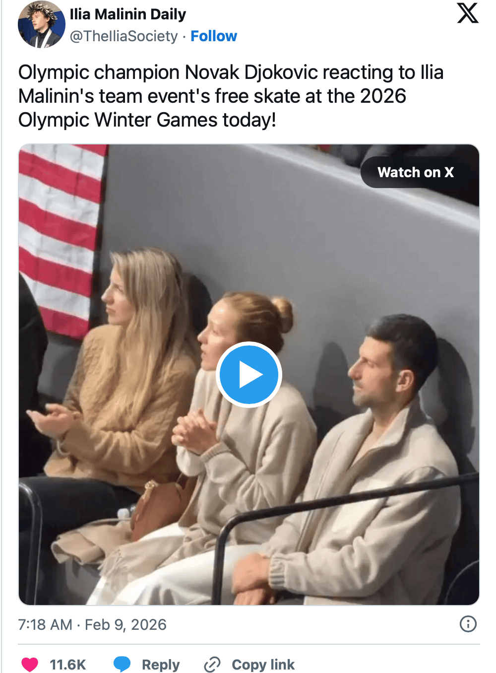 他在靠近冰面的看台观赛,并为选手们的表现鼓掌。在美国新星伊利亚·马利宁完成自由滑后,德约甚至起立鼓掌致意。马利宁赛后表示:“我确实看到了德约科维奇,这真的太不真实了。”