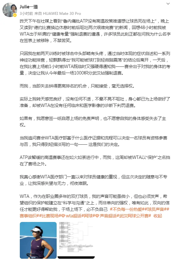 只因我在前两天训练时被球击中头部略有头疼,通过当时体现的症状自述和一系列神经功能排查,轻飘飘得出“我可能被球打到轻微脑震荡”的结论后离开,一天后,在我比赛上场前1小时前WTA既临时又强硬得通知我——赛会出于对我的身体的考量,决定让我从今年最后一场1000积分武汉站强制退赛。