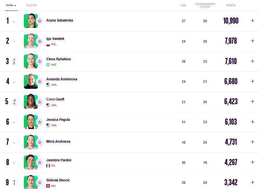 凭借这2000个冠军积分,莱巴金娜的世界排名发生了显著变化。 她在最新一期榜单上,从赛前的世界第五,一跃升至世界第三。 这是她自2024年1月以来,首次重返世界前三的行列。 她的积分来到了7465分,与排在第二位的斯瓦泰克之间,积分差距已经缩小到不足400分。 在过去参加的21场比赛中,莱巴金娜取得了20场胜利,这个数据直观地反映了她当前火热的竞技状态。