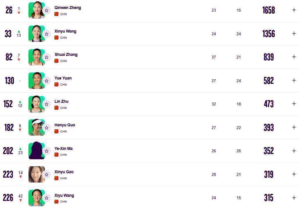相比之下,目前中国女单选手中排名最高的郑钦文,则面临一些挑战。 由于伤病原因,她退出了2026年澳网公开赛的争夺。 随后,她也宣布退出即将开始的WTA500阿布扎比站的比赛。 根据规则,她去年在澳网取得的积分(第三轮)被扣除,而今年因退赛没有获得任何新积分。 这使得她的总积分减少,排名下滑一位,从第25位降至第26位。 她何时能迎来新赛季的首场正式比赛,目前还没有明确的时间表。