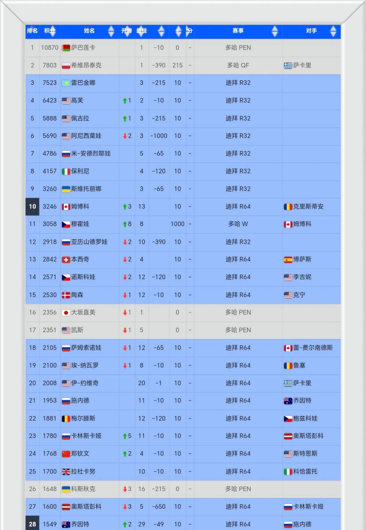 具体来看,TOP10名单出现新面孔——19岁小将姆博科突破层层阻碍首次进入世界前十,展现出强劲潜力。尽管世界第一萨巴伦卡因缺席多哈赛保持领头羊位置,她以10870分稳坐榜首,是目前唯一积分超万的选手且短期内无夺冠威胁。然而昔日世界第一、当前世界第二的波兰名将斯瓦泰克则面临严峻挑战。